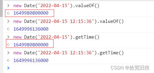JS获取当前时间戳与时间戳转日期时间格式一、获取当前时间的时间戳(三种方式) const t1 = new Date().valueOf() // 第一种,推荐 const t2 = new Date().getTime() // 第二种,推荐 const t3 = Date.parse(new Date()) // 第三种,不推荐,精度差一些 ![]() 注: new Date()得到的是一个时间对象 const times = new Date() // Sat Apr 16 2022 11:07:38 GMT+0800 (中国标准时间) 二、获取指定日期,时间的时间戳 const t = new Date('日期时间').valueOf() // 方法一 const t1 = new Date('日期时间').getTime() // 方法二 const t2 = new Date('2022-04-15').valueOf() // 1649980800000 const t3 = new Date('2022-04-15 12:15:36').valueOf() // 1649996136000 const t4 = new Date('2022-04-15').getTime() // 1649980800000 const t5 = new Date('2022-04-15 12:15:36').getTime() // |